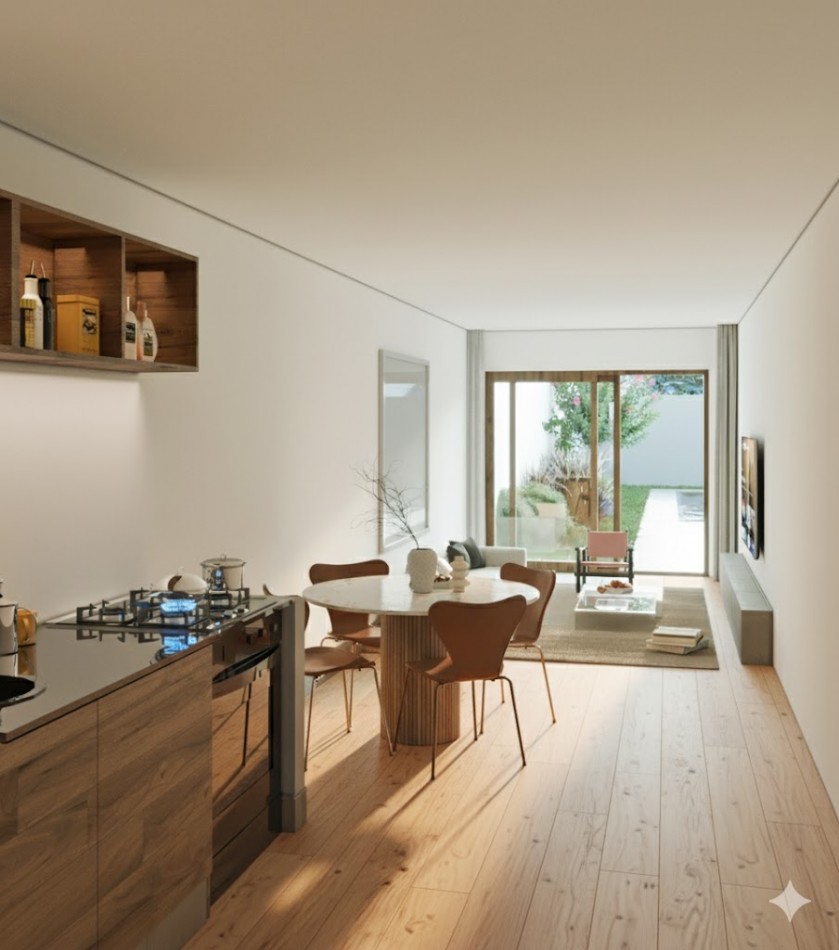 Distribución inteligente: living-comedor con salida directa al jardín, toilette de visitas, cocina separada, dos dormitorios, baño completo y principal en suite con vestidor.