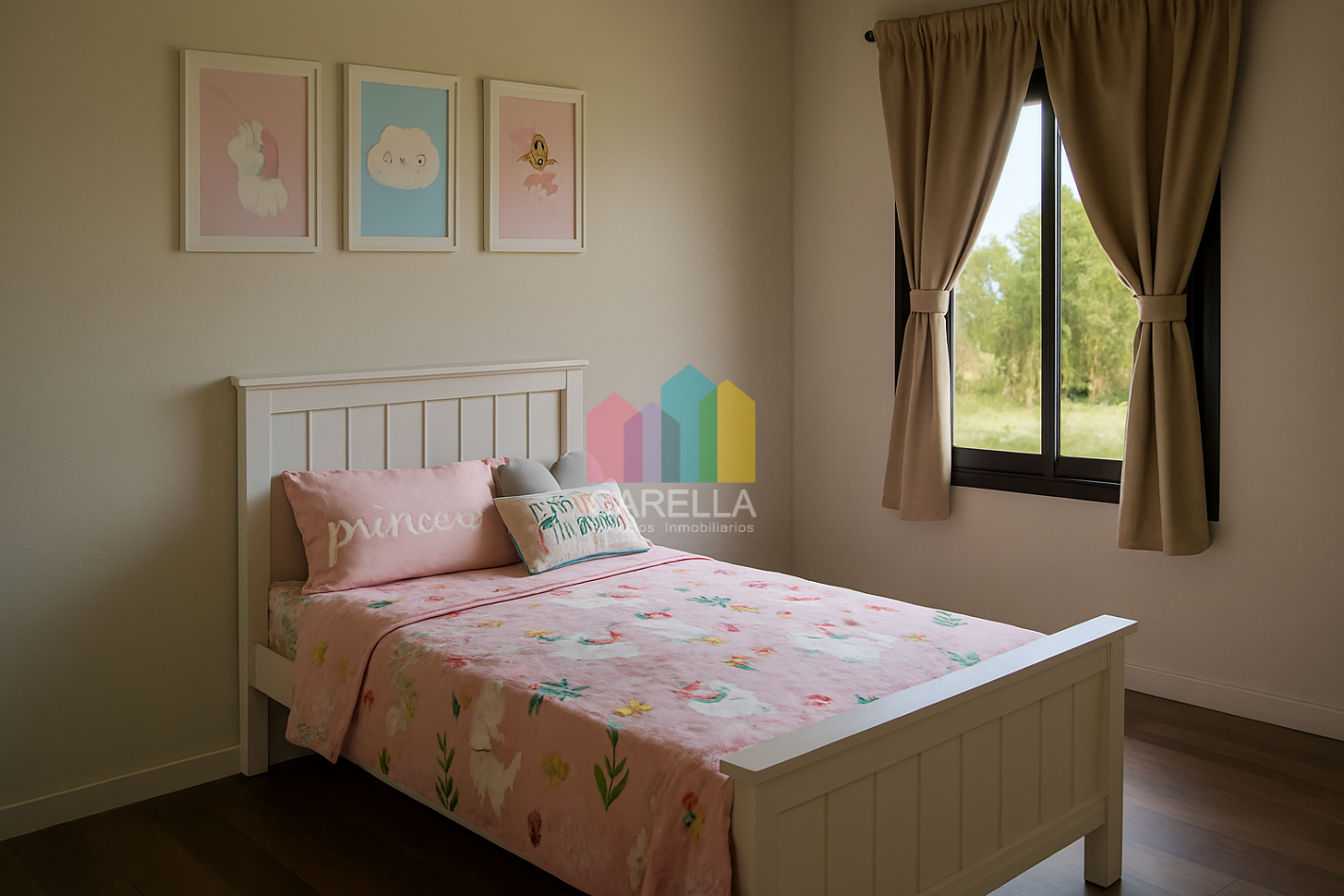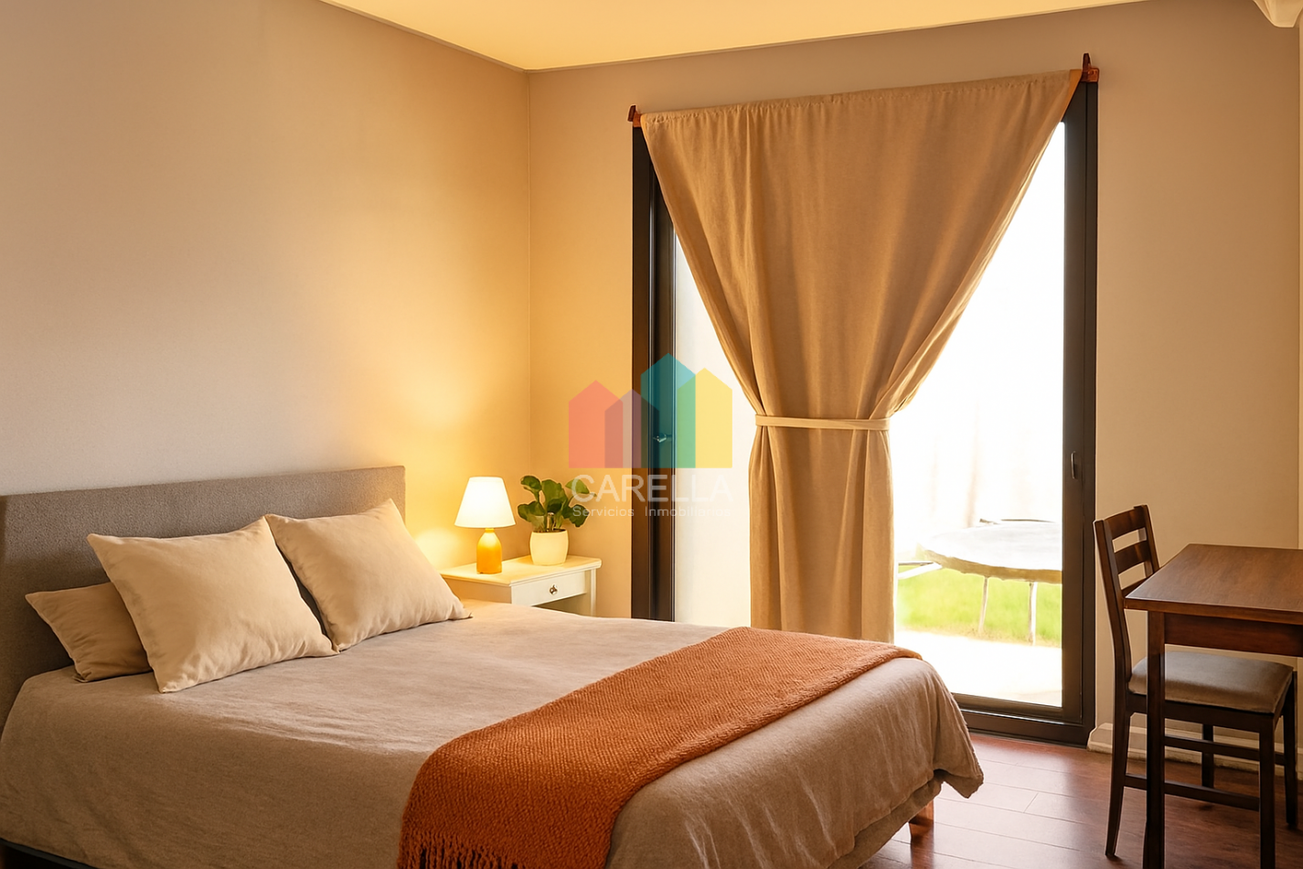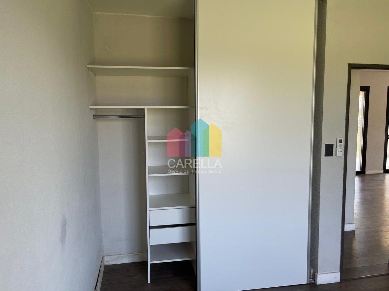 Suite principal con placard, baño completo y vista abierta al jardín.