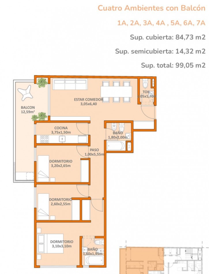 Departamento de cuatro ambientes, tres dormitorios, con cocina integrada, toillete de visitas, dos baños completos, ppal en suite. living comedor con balcón aterrazado.