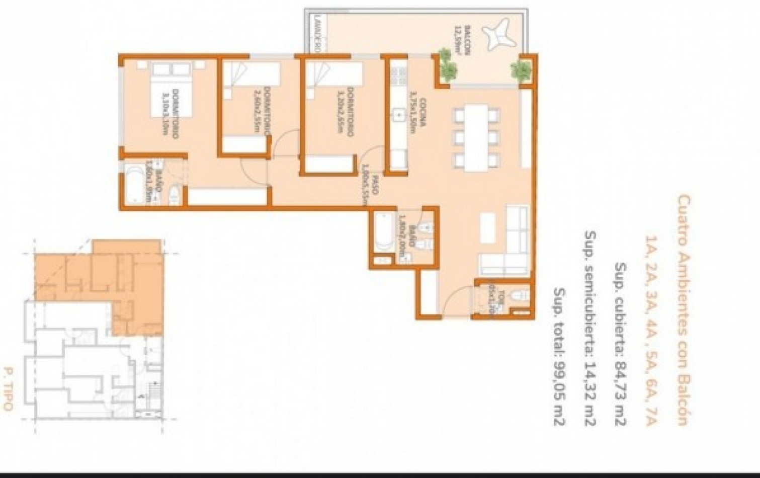 La unidad de 4 ambientes cuenta con 85 m² cubiertos más un balcón terraza de 14 m². Tres dormitorios, principal en suite con ventilación natural. Living comedor amplio con salida al balcón, cocina independiente con ventana, toilette de visitas y dos baños completos.