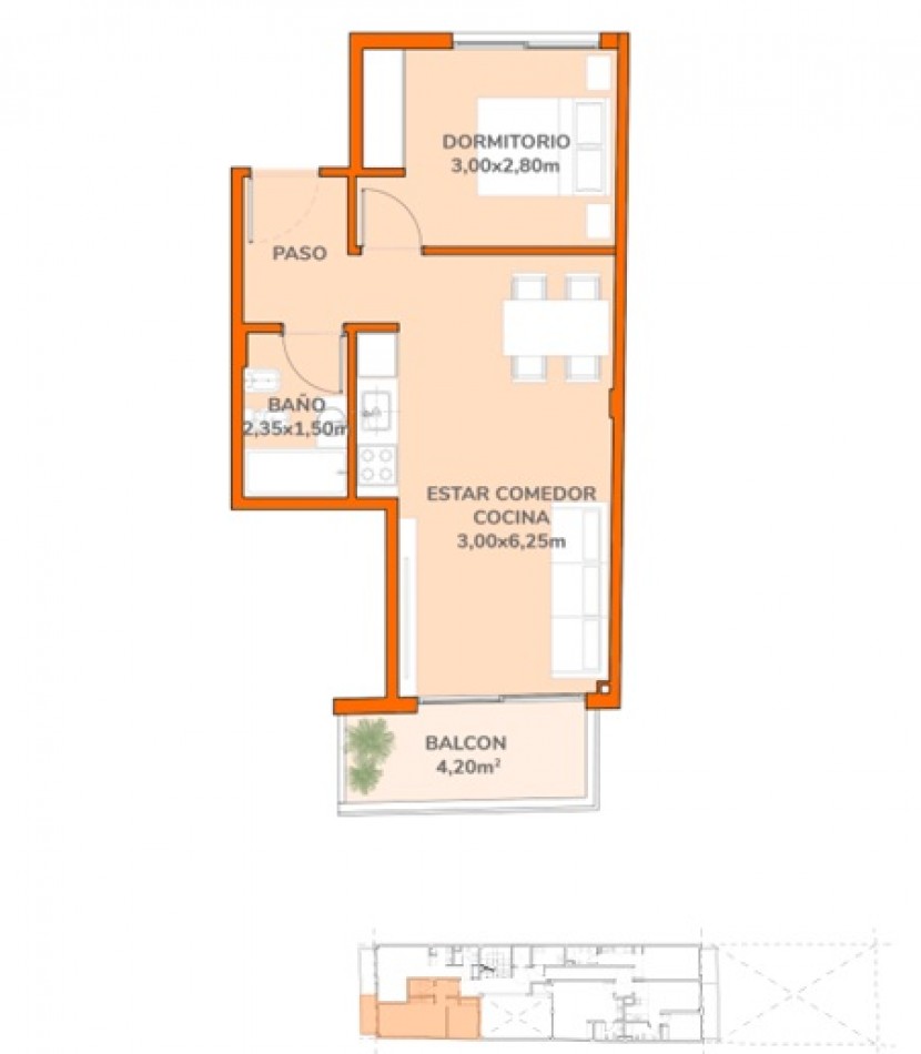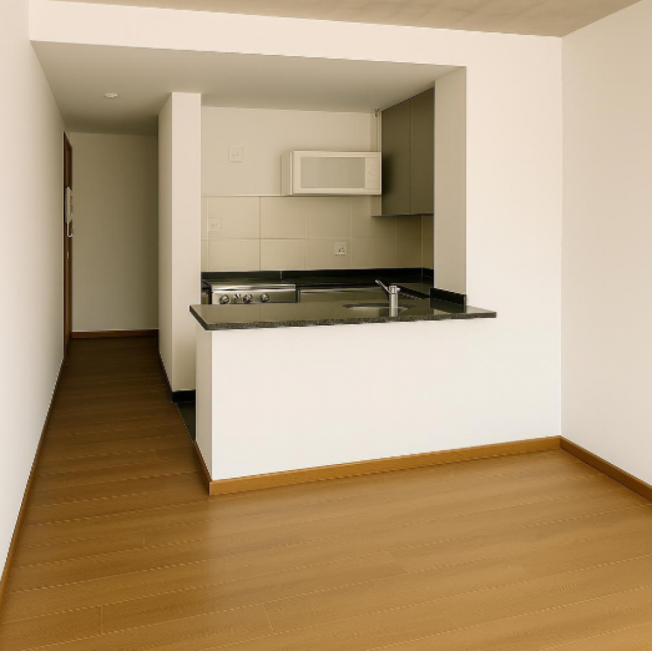 Excelente distribución: dormitorio con placar. Cocina integrada al living comedor y baño completo.