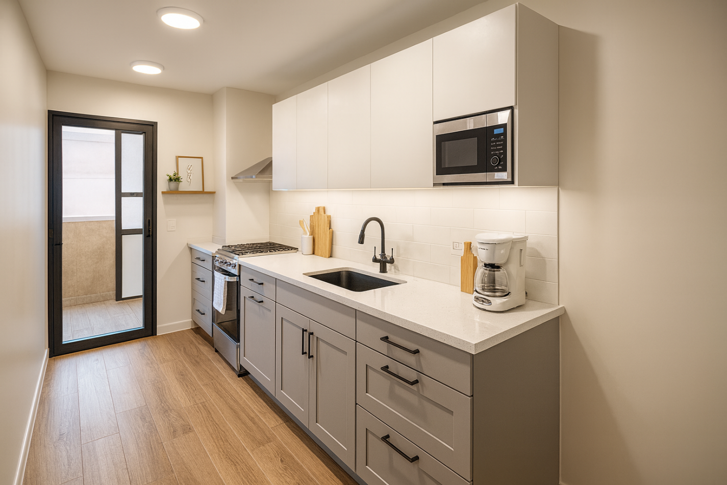 Cocina independiente con salida a balcón cubierto, conectado a uno de los dormitorios.