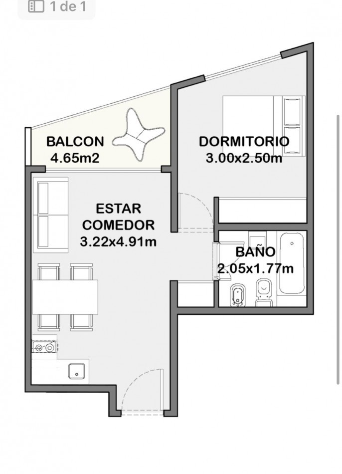 La unidad cuenta con hall de recepción, cocina integrada al living-comedor con salida directa al balcón terraza, orientación noreste que garantiza gran luminosidad, baño completo y dormitorio con placard.