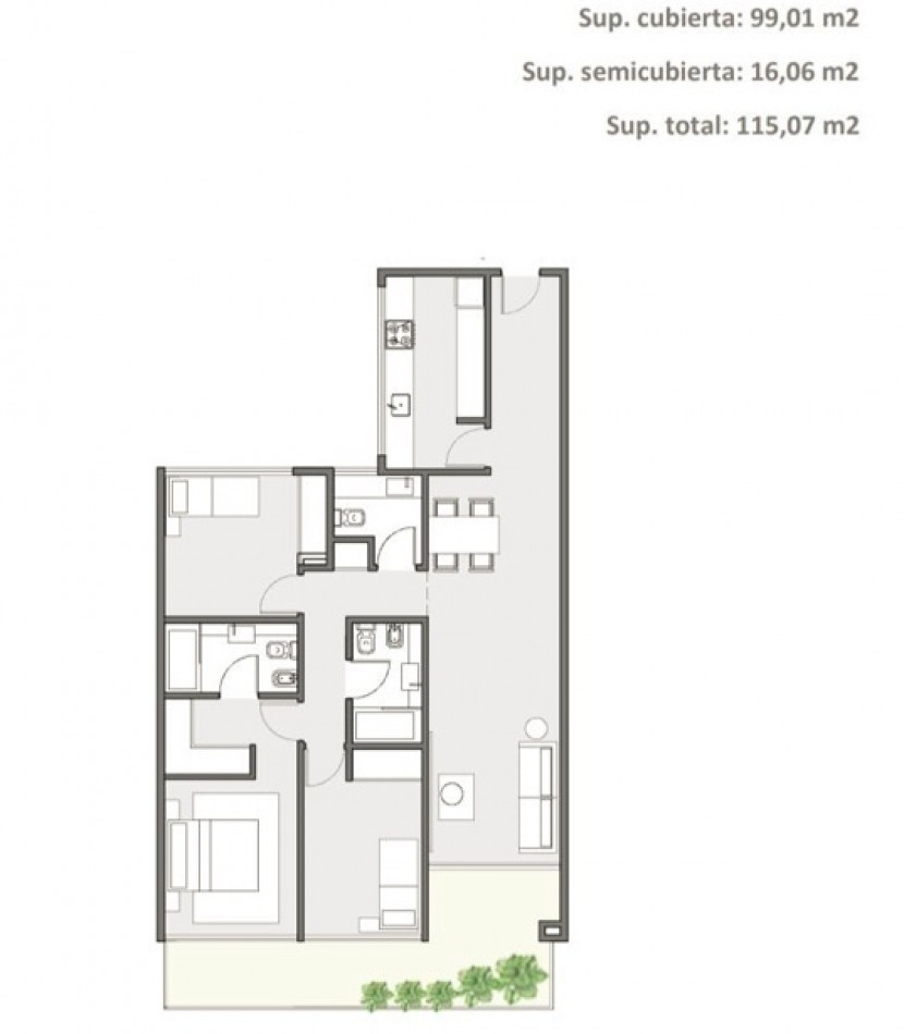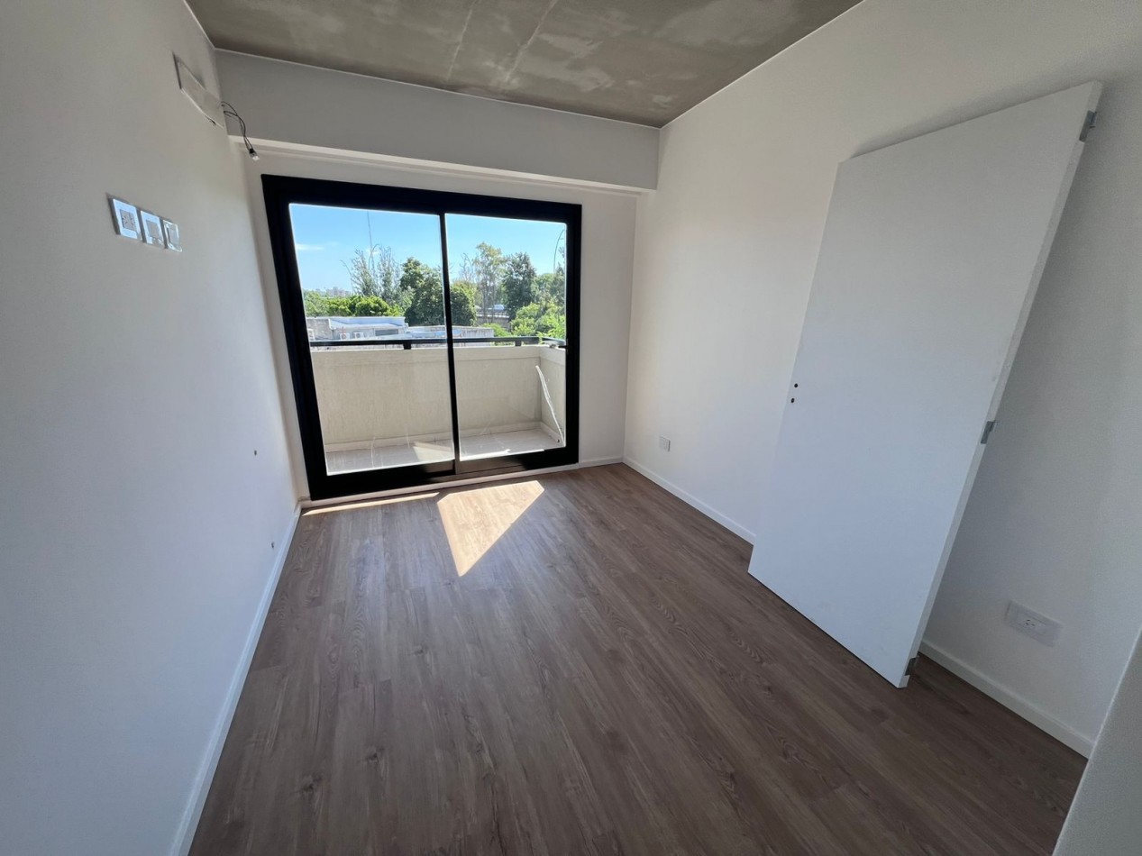 La unidad ofrece un diseño funcional y confortable: hall de recepción, cocina independiente de generosas dimensiones, living comedor con salida directa al balcón aterrazado, toilette de cortesía, baño completo y tres dormitorios, siendo el principal en suite con vestidor. Incluye cochera cubierta en subsuelo.