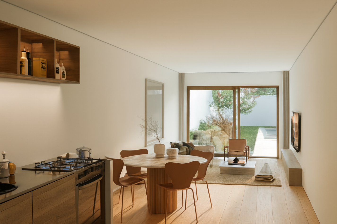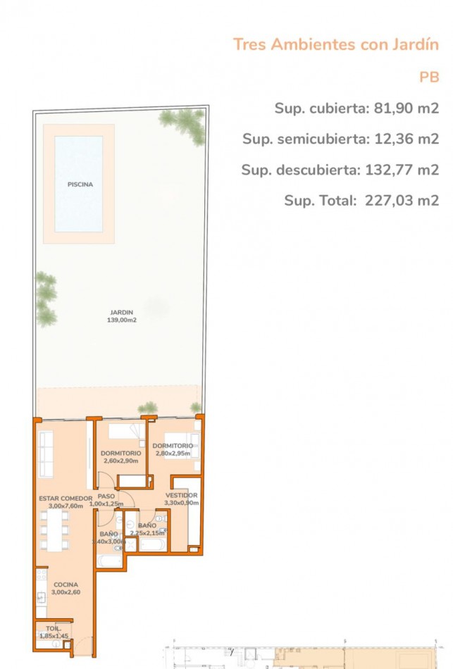 Distribución inteligente: living-comedor con salida directa al jardín, toilette de visitas, cocina separada, dos dormitorios, baño completo y principal en suite con vestidor.
