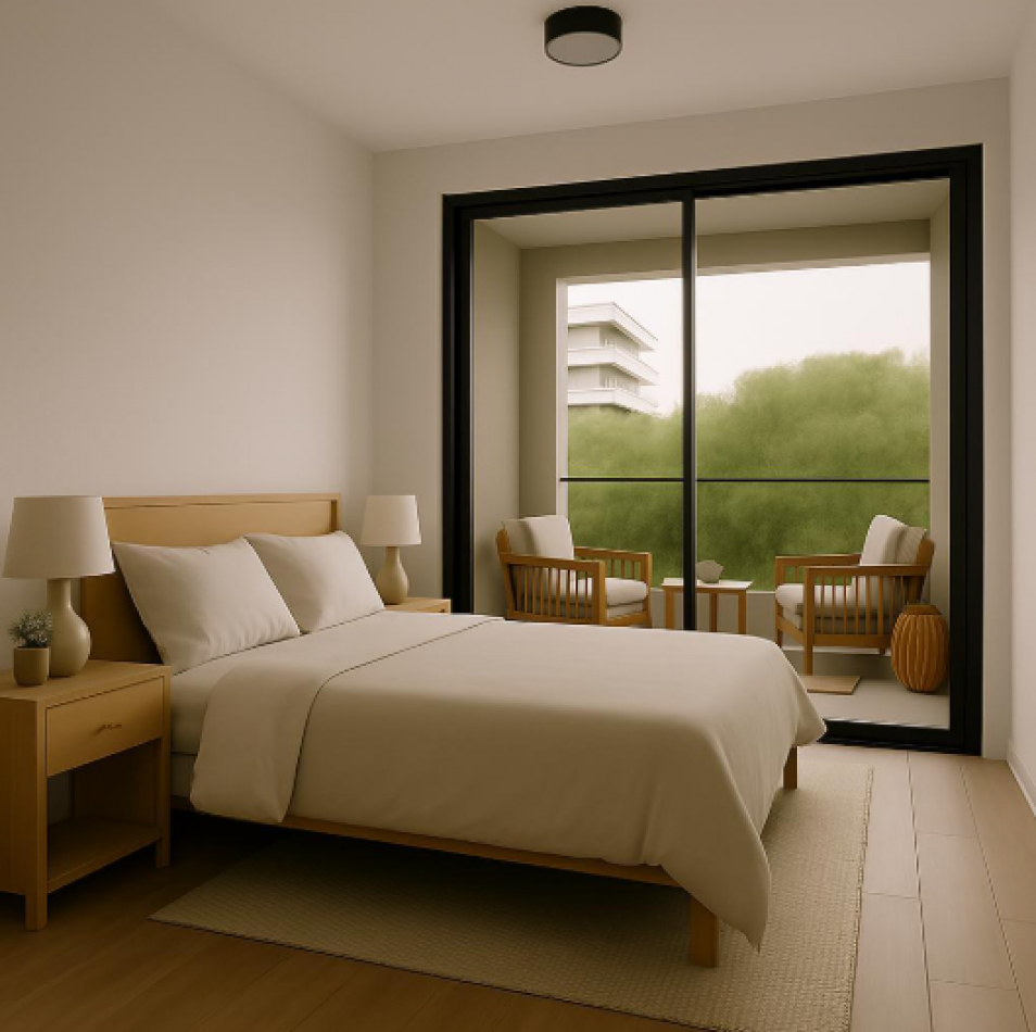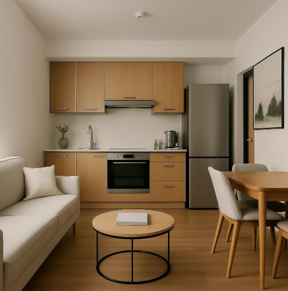 Unidad con hall de recepción, ambiente principal con salida a balcón terraza, cocina integrada y baño completo.
